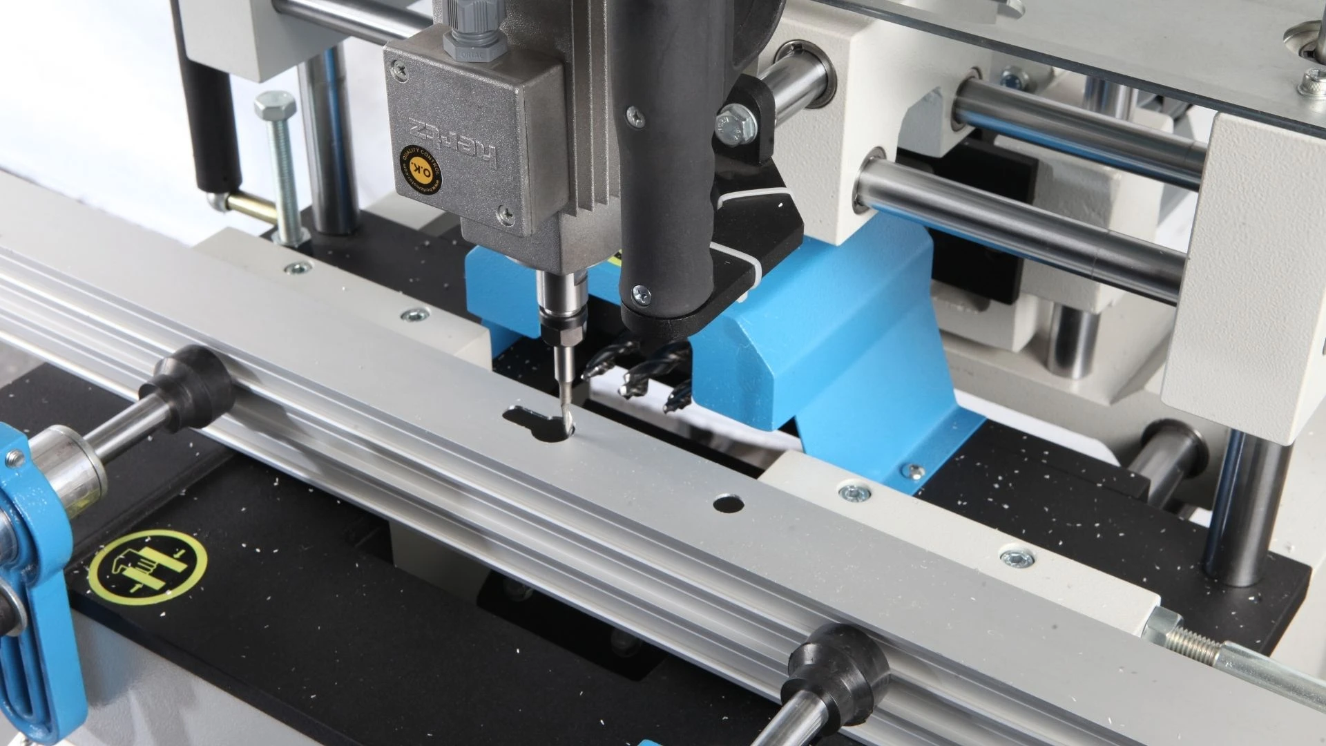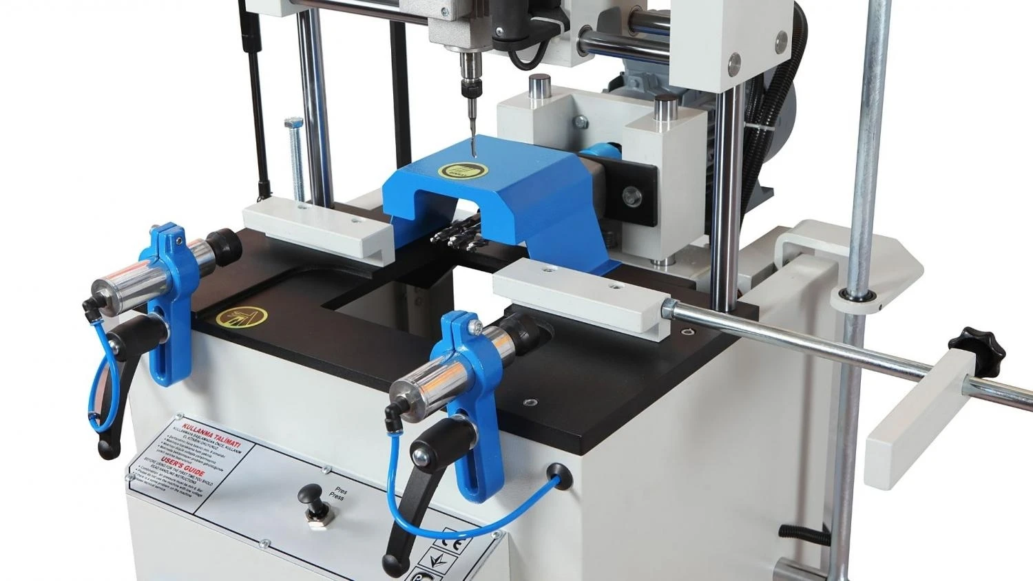 - PVC ve alüminyum profillerinin ispanyolet, barel kilit, pencere kol delikleri ve su tahliye deliklerini açmak için tasarlanmış bir freze makinesidir.